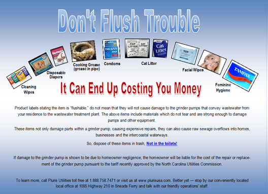 Pluris was called out for an alarm at your location, and it was determined that the pump was jammed with material from your residence – please reference the “Do Not Flush” literature.