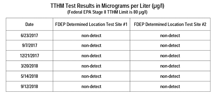 With the latest Florida Department of Environmental Protection (“FDEP”) compliance analytical laboratory testing results on September 12, 2018, TTHM has been non-detected for the past six (6) consecutive quarters. A summary of the past FDEP compliance testing dating back to the beginning of the FDEP permitted pilot study evaluating chlorine dioxide is presented below.