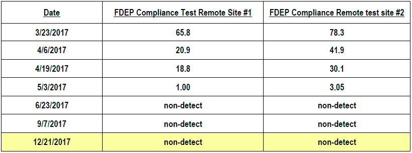 Note: yellow highlighted results represent the latest FDEP mandated quarterly compliance testing