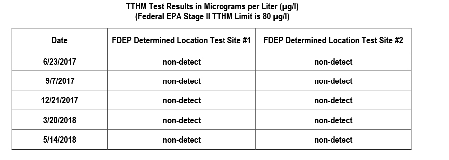 Pluris Wedgefield (“Pluris”) is pleased to announce that the disinfectant by-product, total tri-halomethane (“TTHM”) continues to be non-detected in Wedgefield drinking water. With the latest Florida Department of Environmental Protection (“FDEP”) compliance analytical laboratory testing results on May 14, 2018, TTHM has been non-detected for the past five (5) quarters. A summary of the past FDEP compliance testing dating back to the beginning of the FDEP permitted pilot study evaluating chlorine dioxide is presented below.