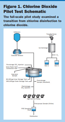 The pilot study (Figure 1) was designed to inject a premixed 0.3 percent ClO2 solution into the ground storage tank downstream of the tray aerators to use the H2S removal and downstream of the softeners to prevent any oxidation of the softening media. After storage, ClO2 was monitored via a handheld analyzer as well as an online analyzer for continuous readings as the water entered the distribution system. Additional monitoring in the distribution system was completed using the handheld analyzer.