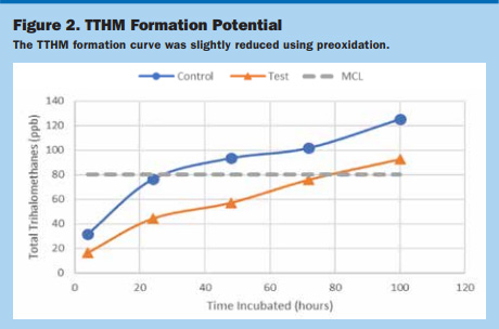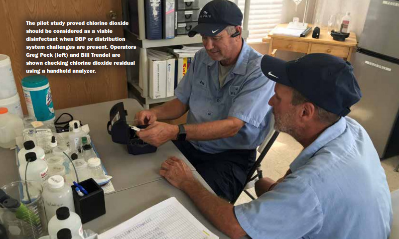 disinfection. This testing was completed by the University of Central Florida’s Environmental Systems Engineering Institute (UCF ESEI) and revealed preoxidation wasn’t suitable. Further testing was conducted to simulate ClO2 as the primary disinfectant. The results proved positive in support of a full transition to ClO2 to reduce TTHMs within the system.