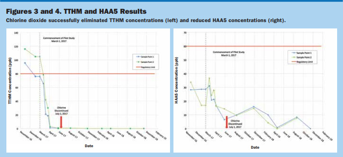 TTHM Reduction. The pilot study results confirmed the combination of ClO2 and chlorine as dual disinfectants effectively reduced TTHM concentrations. Additionally, ClO2 as a primary disinfectant proved to be successful in eliminating TTHMs after the transition from chlorine was completed.