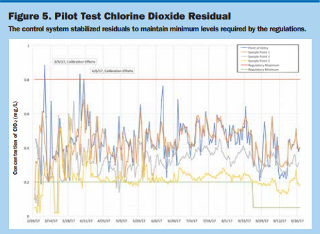 Meeting Chlorine Dioxide Residual Standards. Daily data from the study’s ClO2 residual results are shown in Figure 5. The residual dropped below the 0.2 ppm residual at the beginning of the pilot. There were only two exceedances at the point-of-entry analyzer, which were the result of erratic readings during calibration events. The control system stabilized residuals to maintain minimum levels required by the regulations.