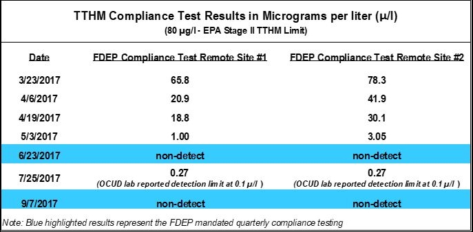 The current Federal Environmental Protection Agency (“EPA”) Stage II limit for TTHM is 80 micrograms per liter (µg/l). Since the introduction of Chlorine Dioxide at the beginning of the Pilot Study, all TTHM results have been below the EPA limit. The most recent TTHM FDEP mandated compliance testing on September 7, 2017 reported TTHM as being non-detected at the two FDEP mandated compliance test sites for the second quarter (sixth consecutive month) in a row. Although not FDEP compliance testing, Orange County Utilities Central Laboratory (“OCUD”) independently sampled water at the two FDEP compliance test locations on July 25, 2017 and performed TTHM testing at its laboratory. The OCUD reported laboratory detection limits at 0.1 micrograms per liter (“µ/l”) and OCUD reported TTHM results for both samples at 0.27 µ/l.