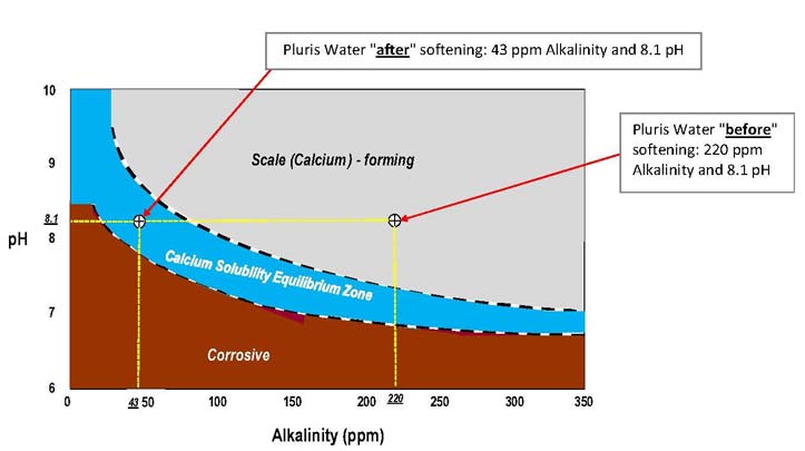Softeners, like the system recently installed by Pluris, reduce the amount of hardness in the water. Prior to softening, Pluris water has a hardness of 220